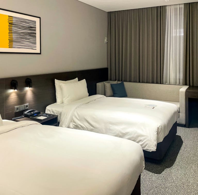 Enjoy comfort and convenience in our modern standard twin room, featuring two cozy single beds, soft linens, and a warm, minimalist design. Perfect for friends, colleagues, or small families, it includes a private workspace, seating area, and all essential amenities for a relaxing stay.